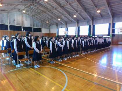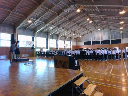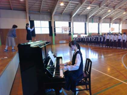 2年・合唱リハーサル・その1 公開日 2023/10/17 更新日 2023/10/17 2学年 10月17日(火) 1,2限 2年生は、1,2限に合唱コンクール・リハーサルをしています。 実行委員が司会進行、動きの説明等も行っています。 最初は、学年合唱「翼をください」の練習です。 学年全体で歌ったのは今日が初めてですが、いい声が出ていました。 (写真:学年合唱の様子)