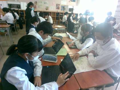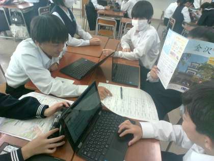 各班、訪問先をクロムブックで詳しく調べたり、地図をみながらルートを考え、行程表に記入したりしていました。