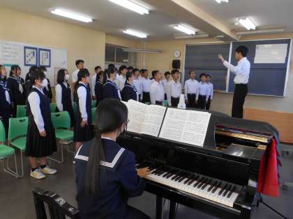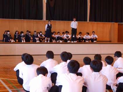 3年2組と2年3組は体育館でお互いの合唱を聴き合い、よかったところや改善点を伝えていました。