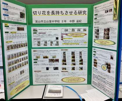 山室中からは中野さん(2年)の作品「切り花を長持ちさせる研究」が展示され、見事「創意工夫賞」を受賞しました。(写真:上)
