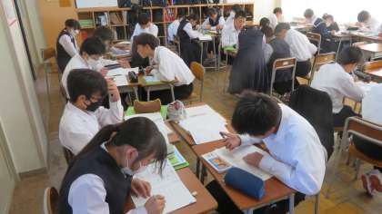 1年・授業風景 公開日 2023/10/26 更新日 2023/10/26 1学年 10月26日(木) 4限 穏やかな秋晴れ、「学習の秋」です! (写真 上:1年3組 国語「方言と共通語」) (写真 下:1年4組 理科「重量パーセント濃度」)