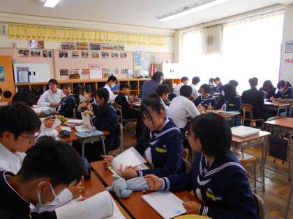 先生の話を一言ももらすまいとする真剣な様子、グループで学びを深めようとする様子がみられます。