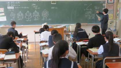 (写真 上:2年4組 数学「合同と平行」)