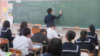 (写真 上:3年1組 数学「三角形の相似条件」)