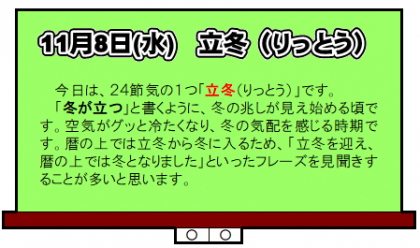 ただ、「立冬」の意味は、この日から冬らしく気温が下がるということなので、これからは、朝夕が冷え込み、肌寒く感じることになると思います。