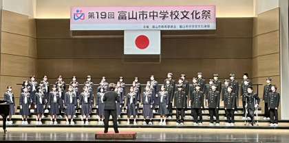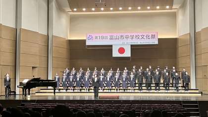 市中学校文化祭・その8 公開日 2023/11/11 更新日 2023/11/11 山室中学校のページ 11月11日(土) 14:15 1年合唱団によるステージ発表「怪獣のバラード」 緊張しながらも、全員で心を一つに合わせて、聴衆に歌声を届けました。