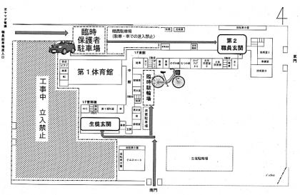 臨時保護者駐車場に駐車し、第2職員玄関よりお入りください。