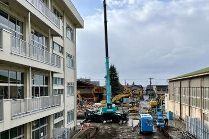 中庭の矢板(建築・土木の基礎工事で、土砂の崩壊や水の浸入を防ぐため、地盤に打ち込む板状の杭)を次々と抜いています。