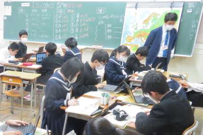 1年・授業風景・その1 公開日 2023/11/29 更新日 2023/11/29 1学年 11月29日(水) 3限 気温が低く、グッと寒くなりました。 体感変化に気を付けて、学習しましょう! (写真 上:1年3組 社会「ヨーロッパ州」) (写真 中,下:1年5組 数学・少人数「図形の移動」)