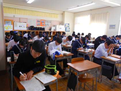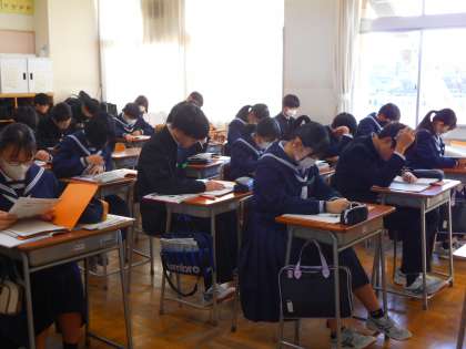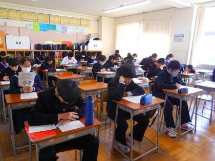 (写真 中:真剣に放送を聞く2年4組の生徒)