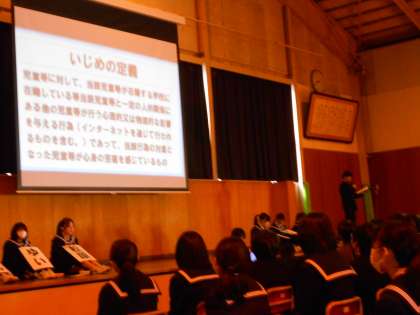執行部による劇「いじめたつもりはなかったのに・・・」の動画を全校生徒で見ました。