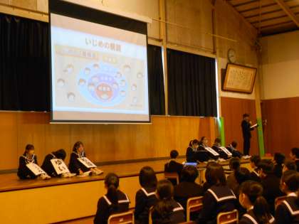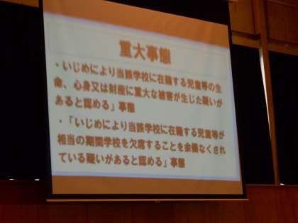 引き続き、執行部の方から、いじめの重大事態やいじめの構造について説明がありました。加害者や被害者だけでなく、傍観者の存在も大きなものなのだと改めて確認しました。