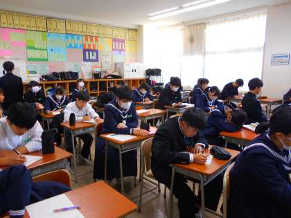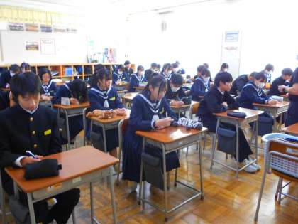 集会後、各教室に戻り、「山中いじめ見逃し0宣言」に署名をしたり、集会の感想を書いたりしました。