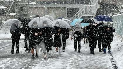 朝の登校風景 公開日 2023/12/22 更新日 2023/12/22 山室中学校のページ 12月22日(金) 7:55 気温は0度、雪がしんしん降っています。 当然、一気に寒くなりました。 今日は、「2学期・終業式」です。