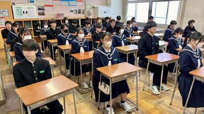 2学期・終業式 公開日 2023/12/22 更新日 2023/12/22 山室中学校のページ 12月22日(金) 2限 意見発表会のあと、「2学期・終業式」を行いました。 (写真 下:真剣に話を聞く2年4組のようす)