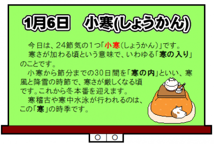 今日は、24節気の一つ「小寒(しょうかん)」です。