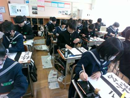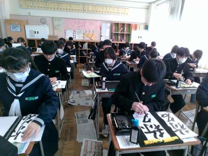 1人3枚の紙を手に、生徒たちは真剣な面持ちで、新年の書き初めに取り組みました。