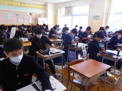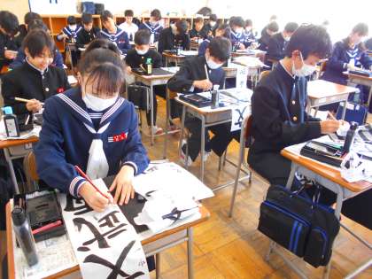 1年・書き初め大会・その1 公開日 2024/01/09 更新日 2024/01/09 1学年 1月9日(火) 3限 1年生は「文武両道」と書いています。 集中して取り組んでいます。 (写真 上:1年1組 中:1年2組 下:1年3組)