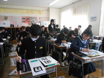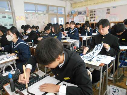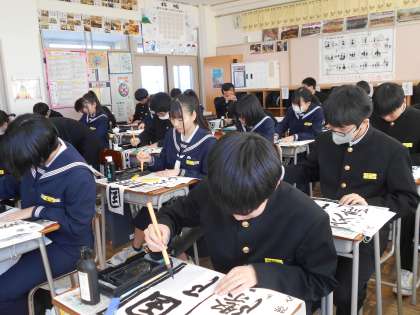 3年・書き初め大会・その3 公開日 2024/01/09 更新日 2024/01/09 3学年 1月9日(火) 3限 3年生は書き初め大会をしました。 今年の課題は「国際交流」です。 行書で書いてあるお手本をよく見ながら、一文字一文字を丁寧に書いていました。 (写真 上:3年2組 中:3年4組 下:3年5組)