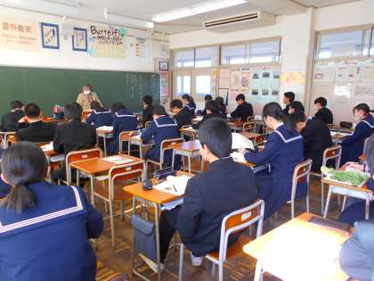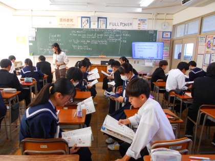3年・授業風景 公開日 2024/01/12 更新日 2024/01/12 3学年 1月11日(木) 4限 3年生の授業では、読み取ったことをまとめたり、先生の説明を前のめりで聞いたり、熱心にペアの音読練習したりしています。 (写真 上:3年2組 国語「夏草」) (写真 中:3年3組 社会 「グローバル化は企業や私たちにどんな影響を与えているか」) (写真 上:3年4組 英語 「ペアですらすら音読できるようになろう」)