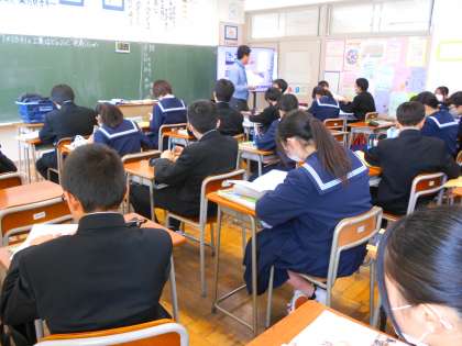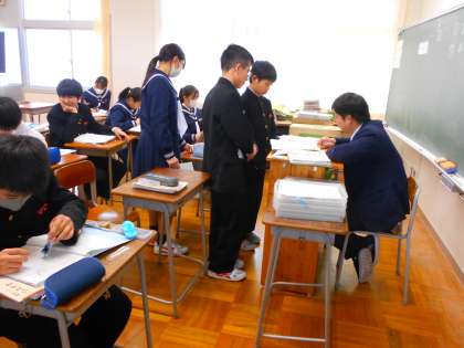 1年・授業風景・その2 公開日 2024/01/16 更新日 2024/01/16 1学年 1月16日(火) 6限 1年生の授業では、先生の助言をもらいながら練習をしたり、実際に立体を見ながら考えたり、学習内容をワークで確認したりなど、熱心に頑張る姿が見られます。 (写真 上:1年4組 数学「平面図形」) (写真 中:1年4組 数学「立体をグループ分けしよう」) (写真 下:1年5組 社会 「北アメリカ州の工業はどのように発展したのか」)