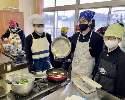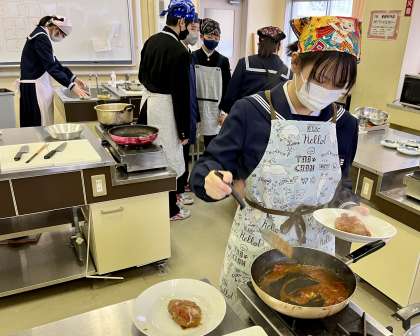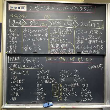 1年・家庭科・調理実習 公開日 2024/01/23 更新日 2024/01/23 1学年 1月23日(火) 1.2限 1年5組の家庭科は、調理実習「五感が喜ぶハンバーグをつくろう」をしていました。 すごく手際がよいのか、2限のはじめに覗くと、ほとんどの班が完成していました。 味はどうだったのでしょうか?