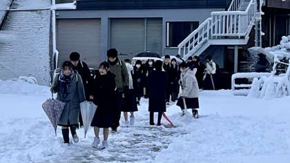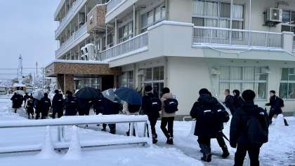 雪を踏みしめて、生徒は今日も元気に登校しています。