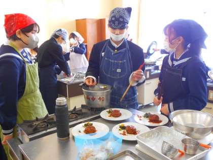家庭科では、おいしそうなハンバーグができあがっていました。