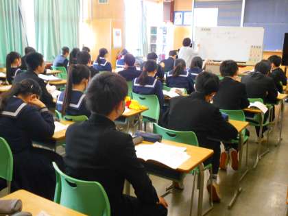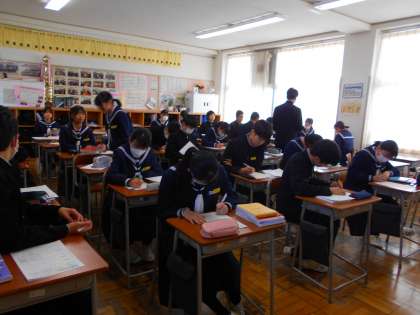 3年・授業風景・その2 公開日 2024/01/30 更新日 2024/01/30 3学年 1月30日(火) 3限 理科や数学では、入試に向けて、先生の説明を聞いて確認したりプリントで復習したりしています。 音楽では、卒業式に向けて、合唱曲「旅立ちの日に」の強弱等を確認しています。 (写真 上:3年1組 理科「惑星の分類」) (写真 中:3年2組 数学「プリント学習」) (写真 下:3年3組 音楽「旅立ちの日に」)