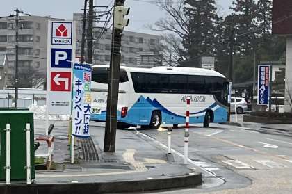 富山第一高校を受検する生徒が、ヤマダ電機駐車場から、貸し切りバスで受検会場である富山第一高校へ向かいます。