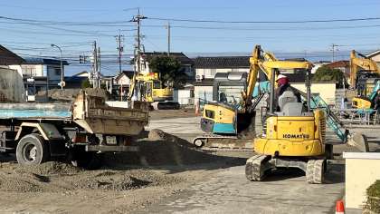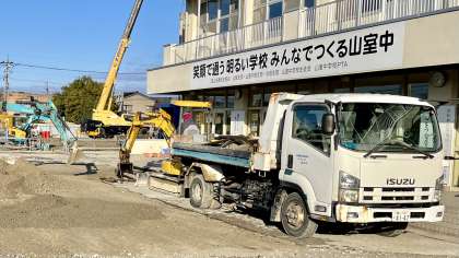 以前から連絡したとおり、今日は朝から生徒玄関前のアスファルト舗装の工事をしています。