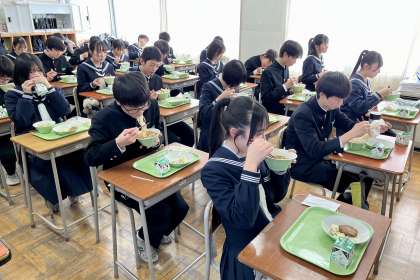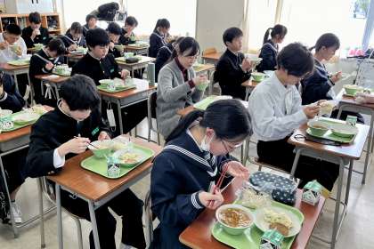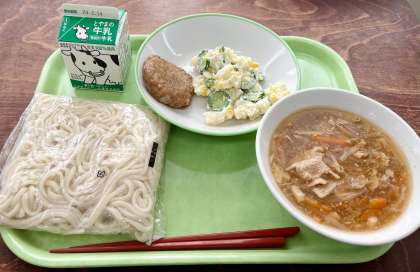 ソフト麺は、いつでも大好き! 公開日 2024/02/07 更新日 2024/02/07 2学年 2月7日(水) 給食 今日の献立は、「ソフト麺、ソフト麺の五目あん、牛乳、鶏つくね、ポテトサラダ」です。(写真:上) ソフト麺は、いつでも生徒の大好物です。 (写真 中:2年2組のようす 下:2年4組のようす)