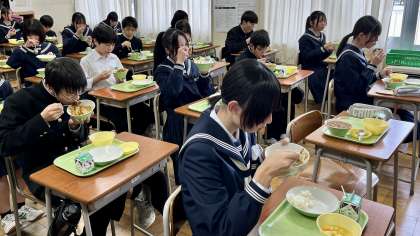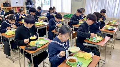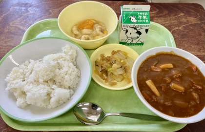 カレーじゃないけれど、ハヤシも大好き! 公開日 2024/02/08 更新日 2024/02/08 2学年 2月8日(木) 給食 今日の献立は、「ごはん、牛乳、たべキリンハヤシ、福神和え、フルーツミックス」でした。(写真:上) カレーじゃないけど、ハヤシも生徒の大好物です。 (写真 中:2年1組のようす 下:2年3組のようす)