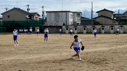 3年・体育・ソフトボール 公開日 2024/02/09 更新日 2024/02/09 3学年 2月9日(金) 1限 3年4,5組男子の体育は、グラウンドでソフトボールをしていました。 日差しが届いていますが、すごく寒いです。 しかし、半袖、ハーフパンツ姿が、元気の象徴です!