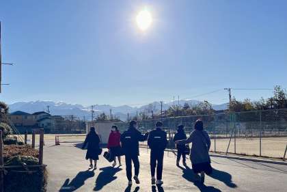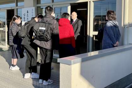 朝、生徒玄関前で校長先生に挨拶して、出発しました。(写真)