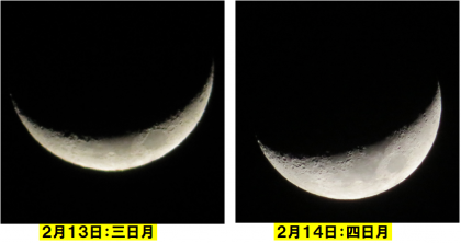 たった1日ですが、…… 公開日 2024/02/14 更新日 2024/02/14 3学年 2月14日(水) 22:00 写真は、昨夜(左)と今夜の月(右)です。 3年生のみなさん 三日月は、日の入り後に、必ず西の空に見えます。 そして、たった1日でこんなに太くなるのです。 冬の代表的な星座「オリオン座」が20:00頃には真南に見え、22:00頃には東の空から春の代表的な星座「しし座」が昇ってきます。 星座からも、確実に春が近づいていることを感じますね!