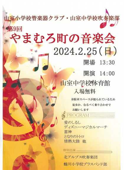 やまむろ町の音楽会 公開日 2024/02/22 更新日 2024/02/22 お知らせ 2月22日(木) コロナ禍でできなかった「やまむろ町の音楽会」が復活します。 ★日 時★ 2月25日(日) 開場13:30 開演14:00 ★場 所★ 山室中体育館 入場無料です。 たくさんの来校をお待ちしています!
