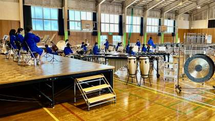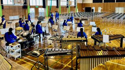 吹奏楽部が、朝から体育館で活動しています。