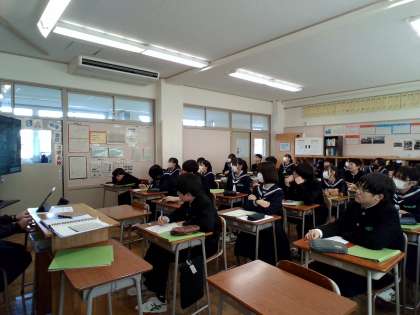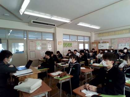 2年・平和学習・5回目 公開日 2024/02/28 更新日 2024/02/28 2学年 2月28日(水) 5限 2年生は平和学習の5回目として、「世界はどうなってきているのか」について考えたり、広島平和記念公園の意味について学んだりしました。 生徒たちは世界に関するクイズに答えたり、平和公園のイメージを発表したりしました。 (写真 上:2年4組 中:2年5組 下:放送室からの発表の様子)