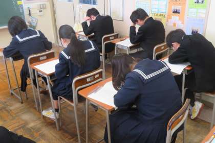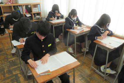 3年・最後のテスト「第7回 実力テスト」・5組 公開日 2024/02/29 更新日 2024/02/29 3学年 2月29日(木) 2限 国語 3年生は、山室中学校での最後のテスト「第7回 実力テスト」をしています。 (1限:社会、2限:国語、3限:理科、4限:英語、5限:数学) 来週7日(木)、8日(金)に行われる県立高校一般選抜を想定して、真剣に取り組んでいる3年5組の様子です。