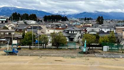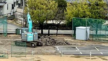 仮駐輪場のアスファルト撤去作業がどんどん進んで、すでに7割程度のアスファルトがはがされ、トラックに積まれています。