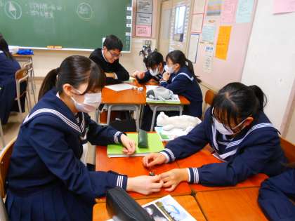 理科では、プリントの手順を見ながら、グループでコイルをつくっています。