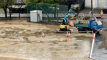 3月4日(月) 9:00 あいにくの天気ですが、仮駐車場の整地がどんどん進んでいます。