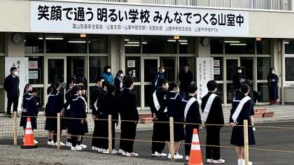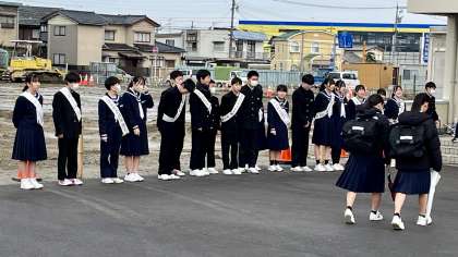 朝の登校風景・その2 公開日 2024/03/05 更新日 2024/03/05 山室中学校のページ 3月5日(火) 7:55 今朝は、雨が降っていないので、選挙運動は生徒玄関前で行いました。 元気な声が生徒玄関前に響いています!