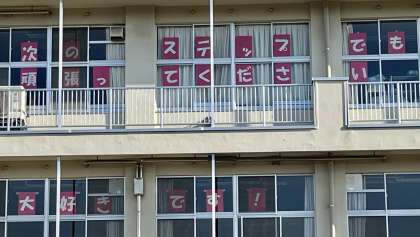 1,2年生から3年生へのメッセージ! 公開日 2024/03/11 更新日 2024/03/11 山室中学校のページ 3月11日(月) 7:55 気温は3度、天気は晴れ。 放射冷却のため、すごく寒い朝です。 生徒が元気に登校してきました。(写真:上、中) おやっ! 生徒玄関の上のメッセージが変わっています。(写真:下) 「次のステップでも頑張ってください! 大好きです!」 3年生のみなさん、見てますか?