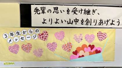 3年生から1,2年生へのメッセージ! 公開日 2024/03/11 更新日 2024/03/11 山室中学校のページ 3月11日(月) 7:55 おやっ! 生徒玄関の生徒会掲示板に、3年生から1,2年生へのメッセージが掲示されています。 1,2年生のみなさん、見てますか?