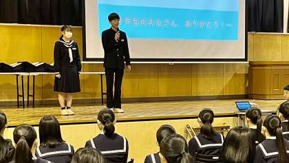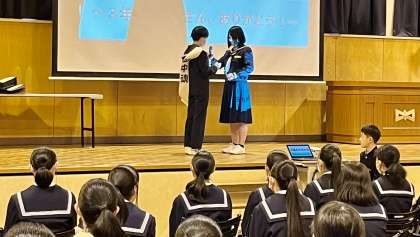 前期生徒会長から後期生徒会長へタスキが渡されました。
