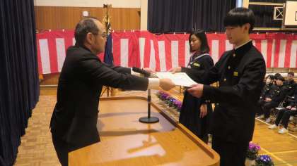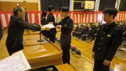 「PTA記念品授与式」のあと、1,2年生が体育館に入場し、全校生徒が揃い、「各賞授賞式」を行いました。