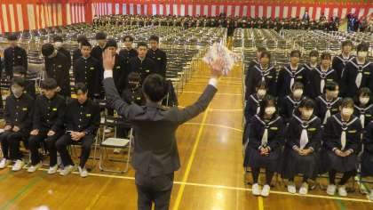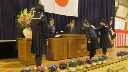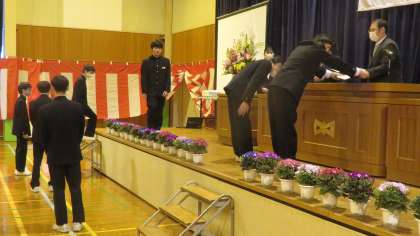 卒業式予行 公開日 2024/03/13 更新日 2024/03/13 山室中学校のページ 3月13日(水) 4限 「3年・修了式」のあと、「卒業式予行」を行いました。 (写真 上:入場の練習 中、下:卒業証書授与の練習)