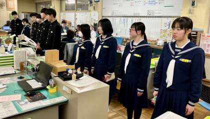 3学年代表・謝恩の儀 公開日 2024/03/13 更新日 2024/03/13 3学年 3月13日(水) 8:05 第3学年協議会12名が職員室を訪れ、これまでお世話になった教職員への感謝の気持ちを伝えました。